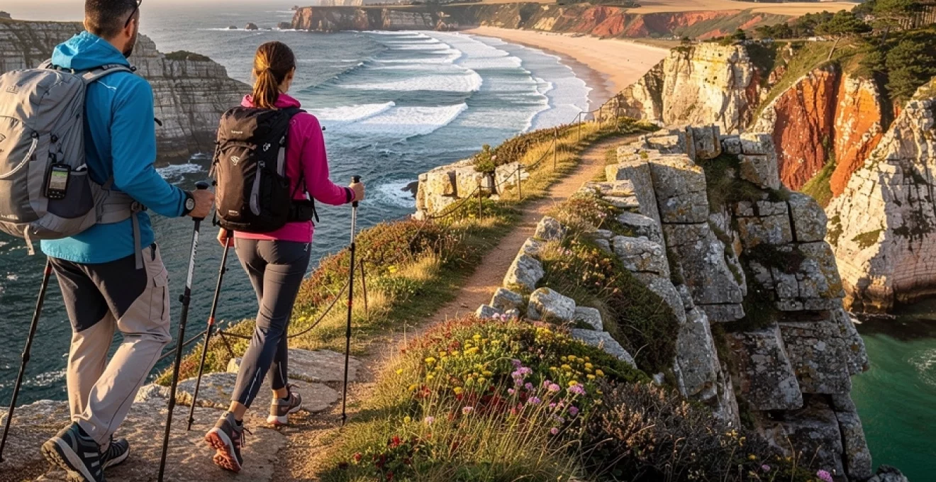 En randonnée maritime, les bâtons jouent un double rôle : soulager les genoux dans les dénivelés répétitifs, et tester l’adhérence du sol avant de poser le pied, en particulier sur les rochers humides ou les passages vaseux. Comme une troisième et une quatrième jambe, ils permettent de répartir les appuis et de rattraper plus facilement un déséquilibre. Sur les falaises étroites, ils peuvent toutefois gêner si l’on ne maîtrise pas bien leur maniement ; il est alors préférable de les raccourcir ou de les replier temporairement.